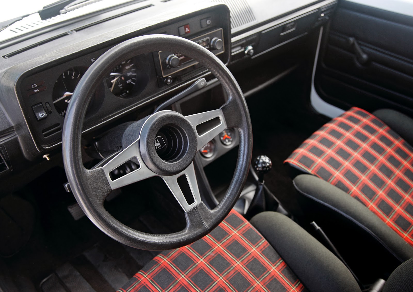 | El primer interior: el escudo de Wolfsburg y el clásico tapizado cuadrillé. |